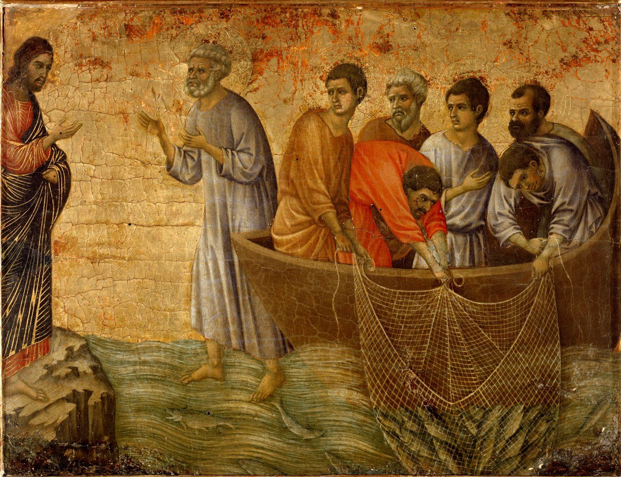 Da sagte jener Jünger, den Jesus liebte, zu Petrus: »Es ist der Herr!« Als Simon Petrus hörte, daß es der Herr sei, legte er sich das Überhemd um – er war nämlich ohne Kleid – und warf sich in den See …